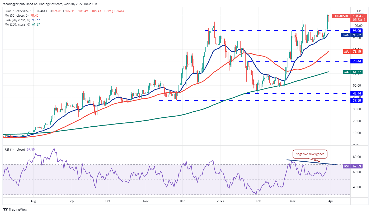 Terra’s LUNA token broke and closed above the overhead resistance at $96 on March 28. Although the long wick on the day’s candlestick showed selling near $100, the bulls did not allow the price to break back below $96.