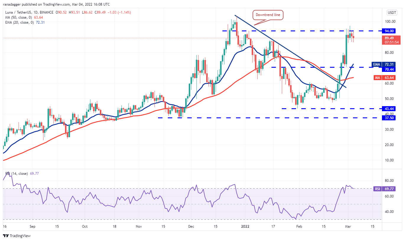 Terra’s LUNA token has failed to sustain above $94 but the positive sign is that the buyers have not given up much ground. The bulls have repeatedly bought the dip to $86 in the past three days.