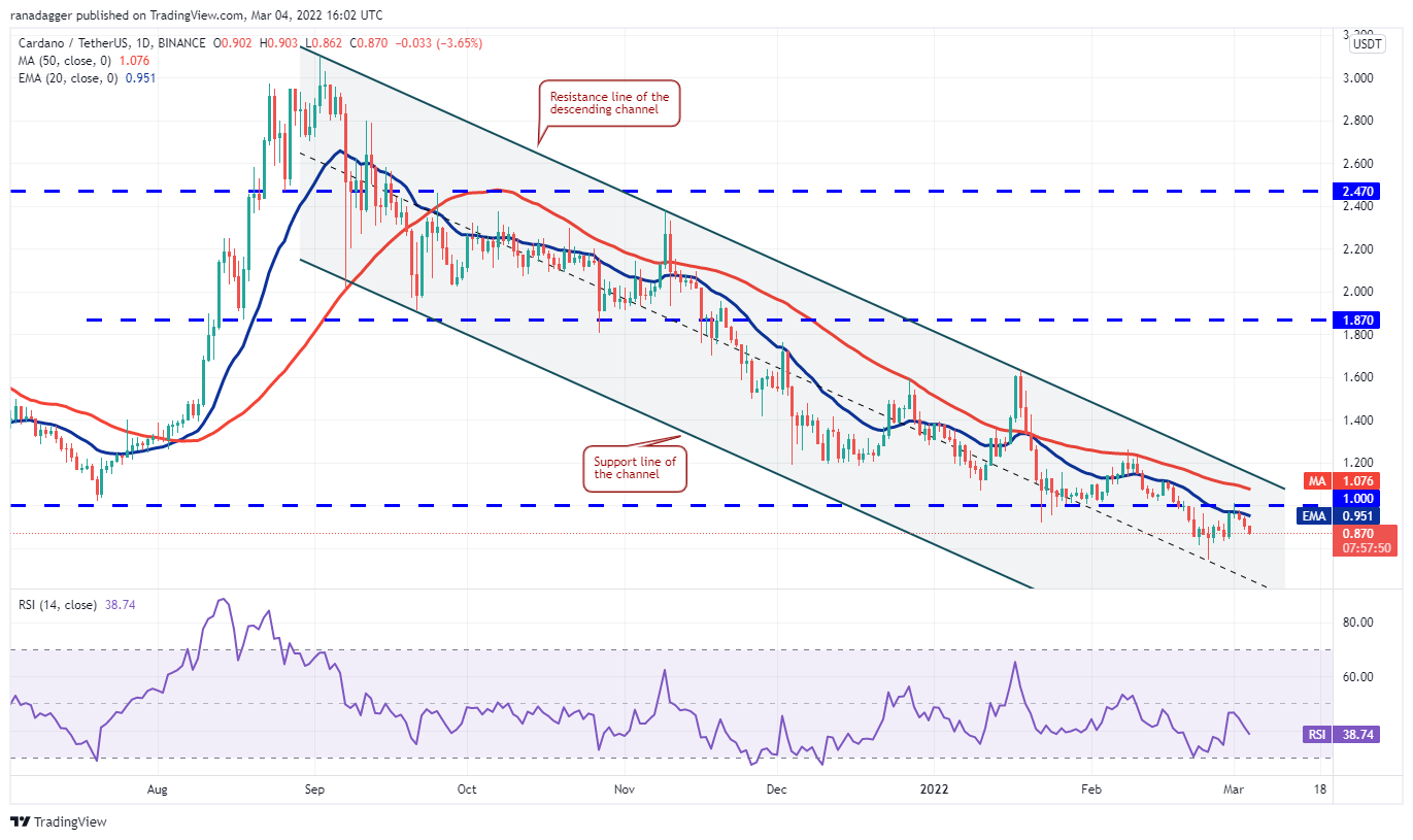 The bears will now make an effort to pull the price below the immediate support at $0.82 and challenge the Feb. 24 intraday low at $0.74. If this level also cracks, the ADA/USDT pair could extend its downtrend to $0.68.