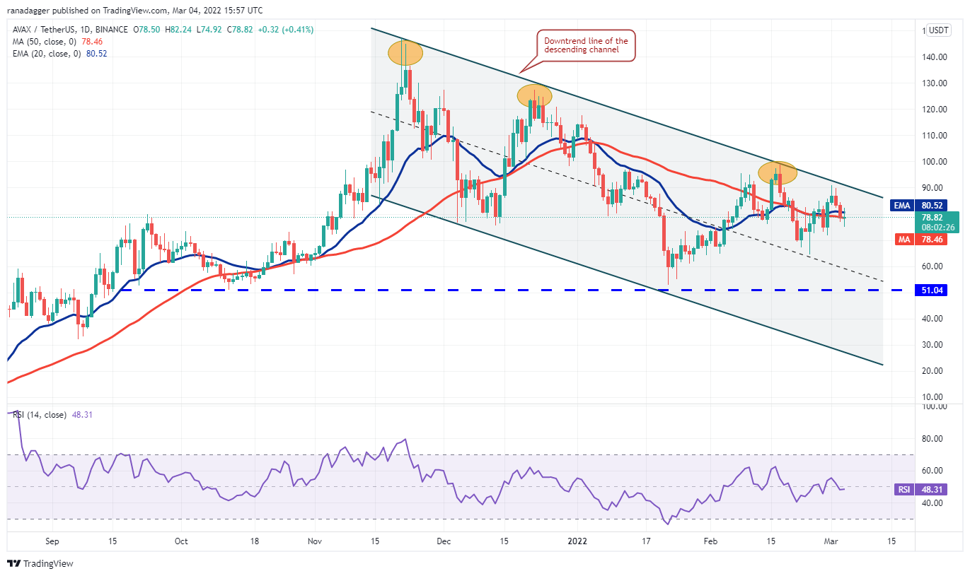The bears are attempting to sustain the price below the moving averages while the bulls are buying the dips and trying to maintain the AVAX/USDT pair above the 20-day EMA ($80). The flattish 20-day EMA and the RSI near the midpoint indicate a balance between supply and demand.