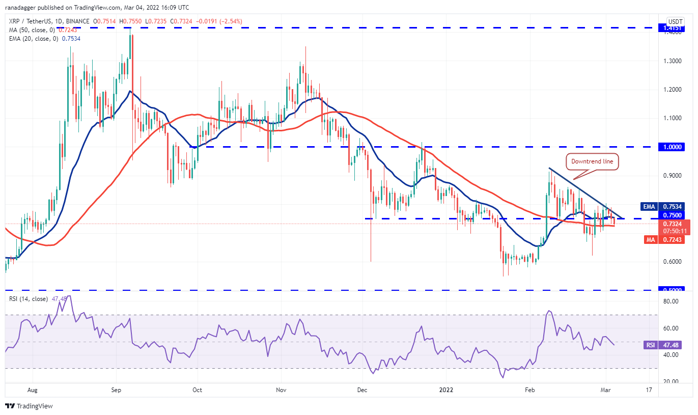 Ripple (XRP) turned down from the downtrend line and dropped to the 50-day SMA ($0.73) indicating that bears have not yet thrown in the towel.