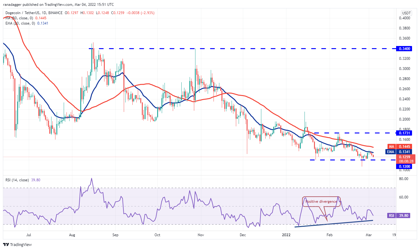 Dogecoin’s (DOGE) relief rally stalled at the 20-day EMA ($0.13), indicating that bears are unwilling to let go of their advantage. The bears are trying to pull the price to the strong support at $0.12.