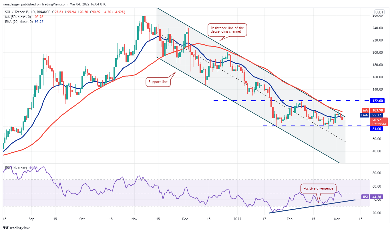 Solana (SOL) rose above the resistance line of the descending channel on March 2 but the bulls could not overcome the barrier at the 50-day SMA ($103). The failure to do so could have attracted profit-booking by short-term traders. This pulled the price back inside the channel.