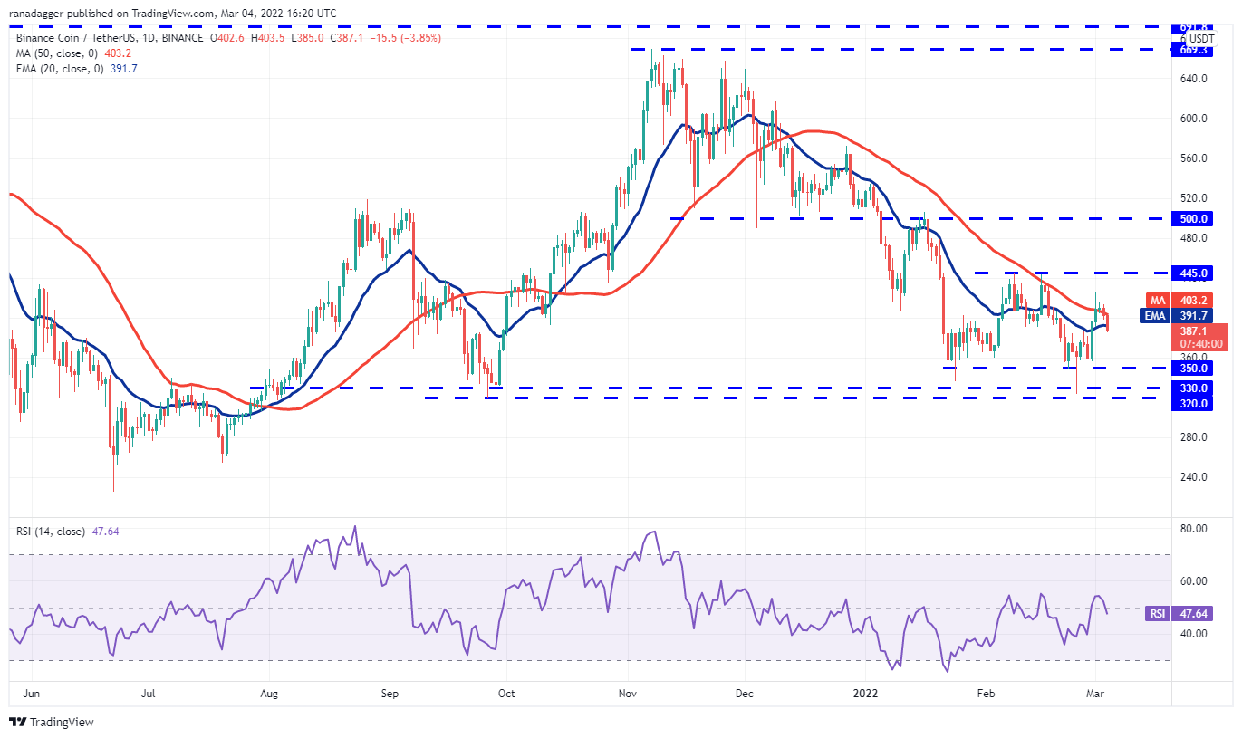 The sellers are trying to sink and sustain the price below the 20-day EMA ($391). If they do that, the BNB/USDT pair could drop toward the strong support at $350.