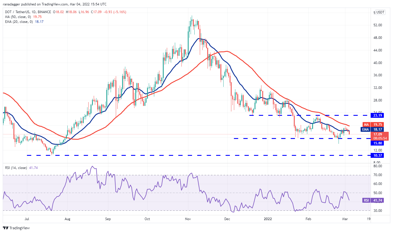 Polkadot’s (DOT) failure to break above the 50-day SMA (19) indicates that the sentiment remains negative and traders are selling on rallies to stiff resistance levels.
