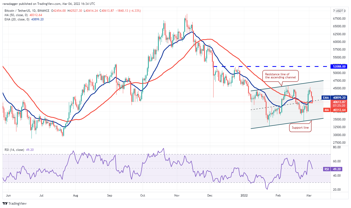 If the price rebounds off the moving averages, it will suggest that bulls are buying on dips. The bulls will then try to push the price above the overhead resistance zone at $45,821 and the resistance line of the ascending channel. If they succeed, the BTC/USDT pair could rally toward the next major resistance at $52,088.