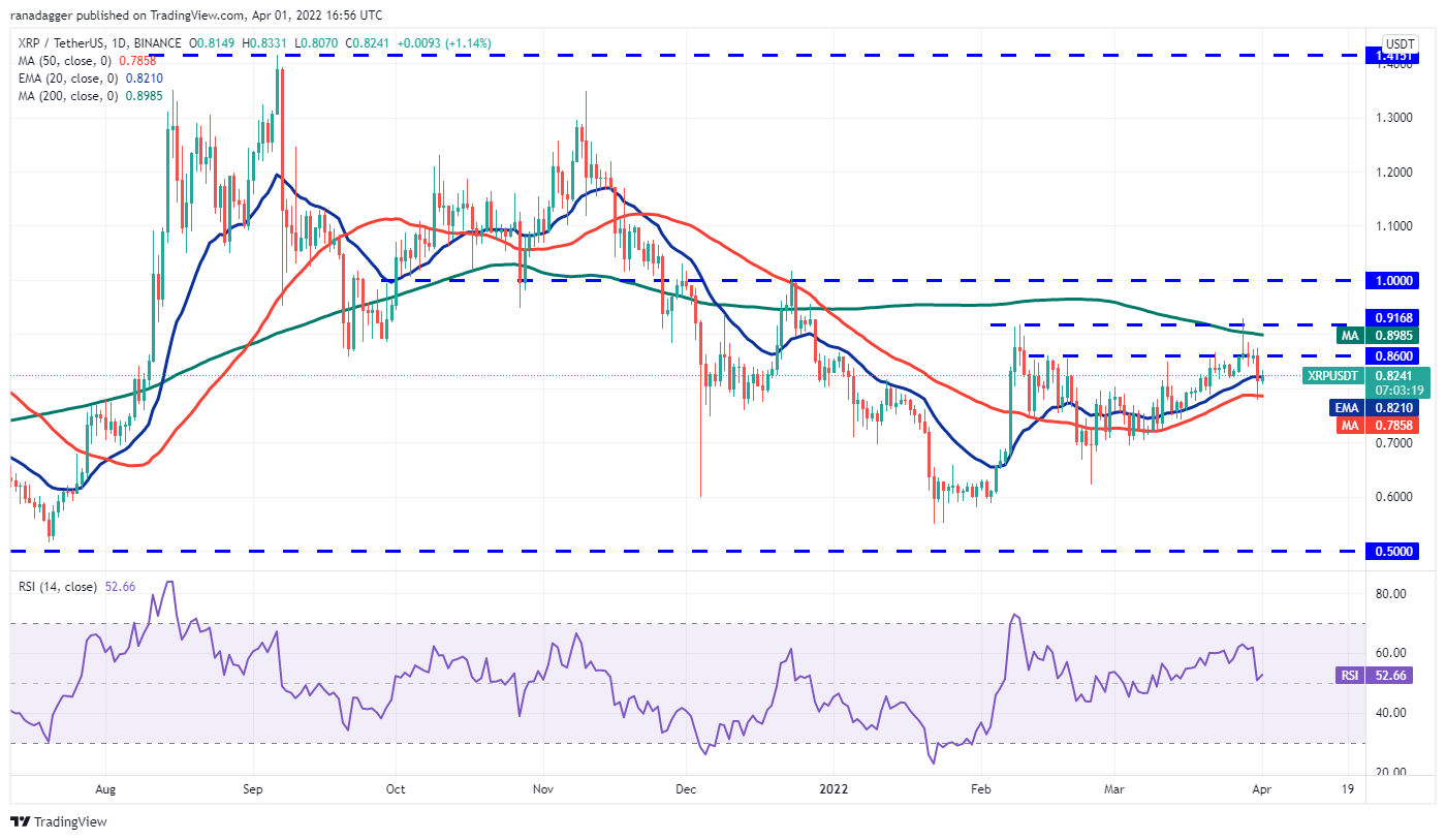 The 20-day EMA ($0.82) is flattening out and the RSI has dropped close to the midpoint, suggesting that the bullish momentum may be weakening. If the price breaks below the 50-day SMA ($0.78), the XRP/USDT pair could slide to the next support at $0.70.