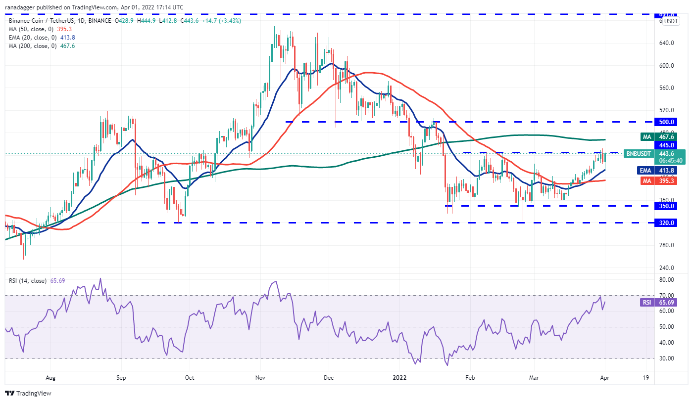 If bulls push and sustain the price above $445, the BNB/USDT pair could rise to the 200-day SMA ($467) and then make a dash to the psychological level at $500.