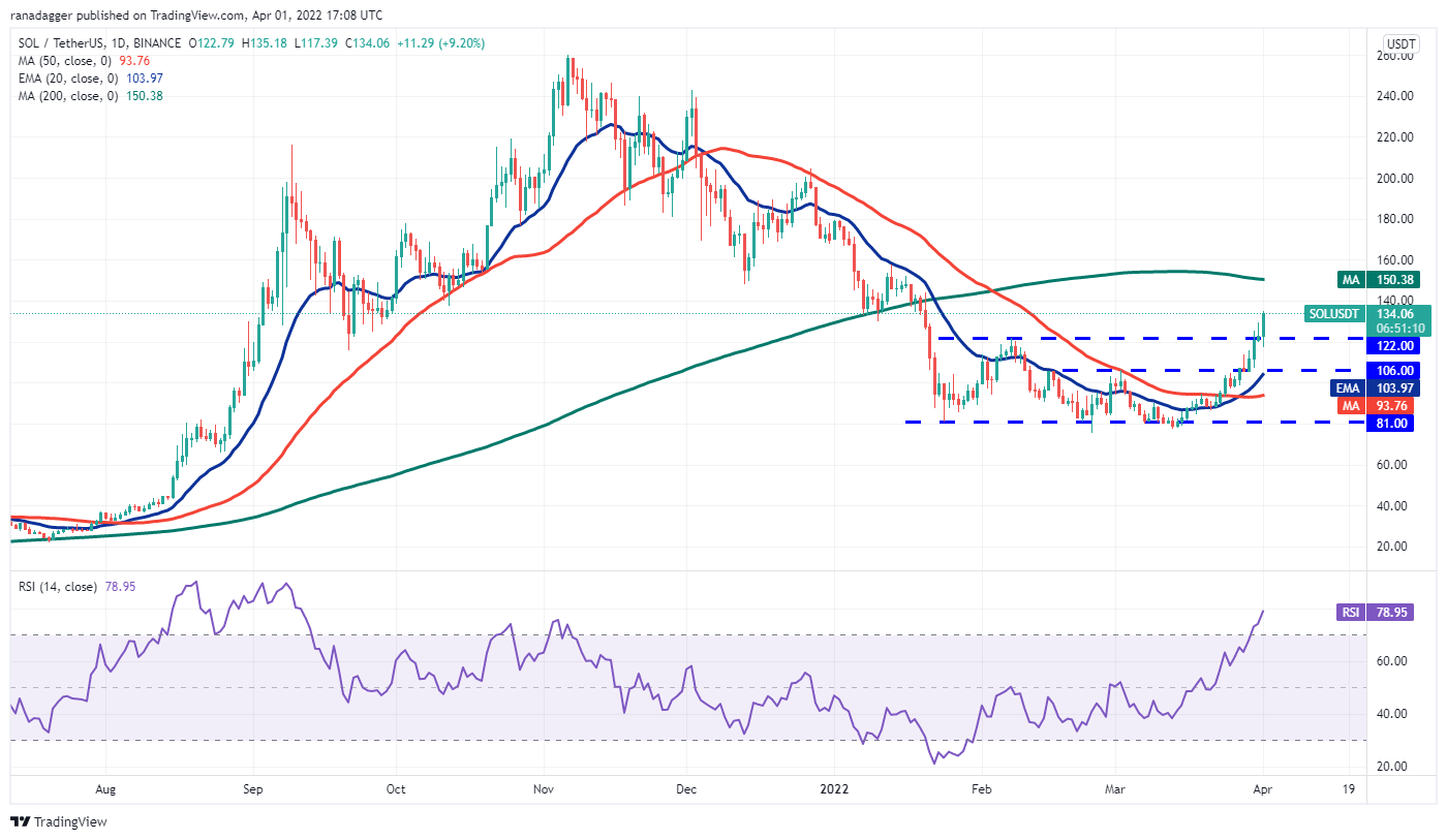 Solana (SOL) had been witnessing a tough battle between the bulls and the bears near the critical level at $122. The long wick on the March 31 candlestick indicated selling at higher levels but the bears could not sustain the price below $122 on April 1.