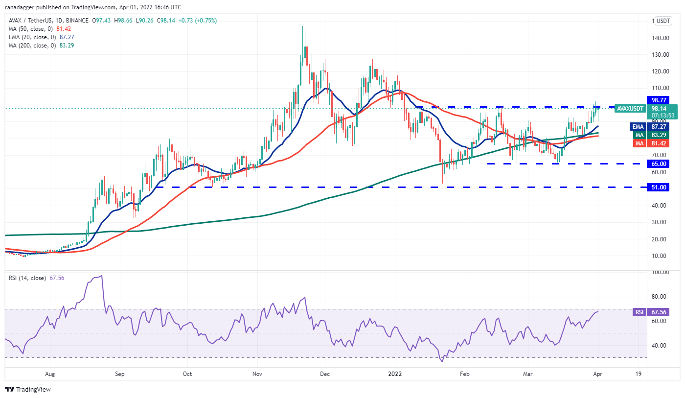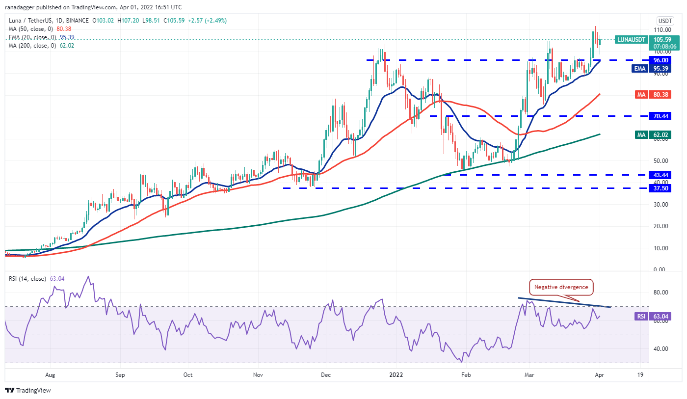 Terra’s LUNA token turned down after hitting a new all-time high on March 30, indicating that the bears are attempting to stall the uptrend. However, a minor positive is that the bulls have not allowed the price to break below $96. This suggests that the bulls are attempting to flip this level into support.