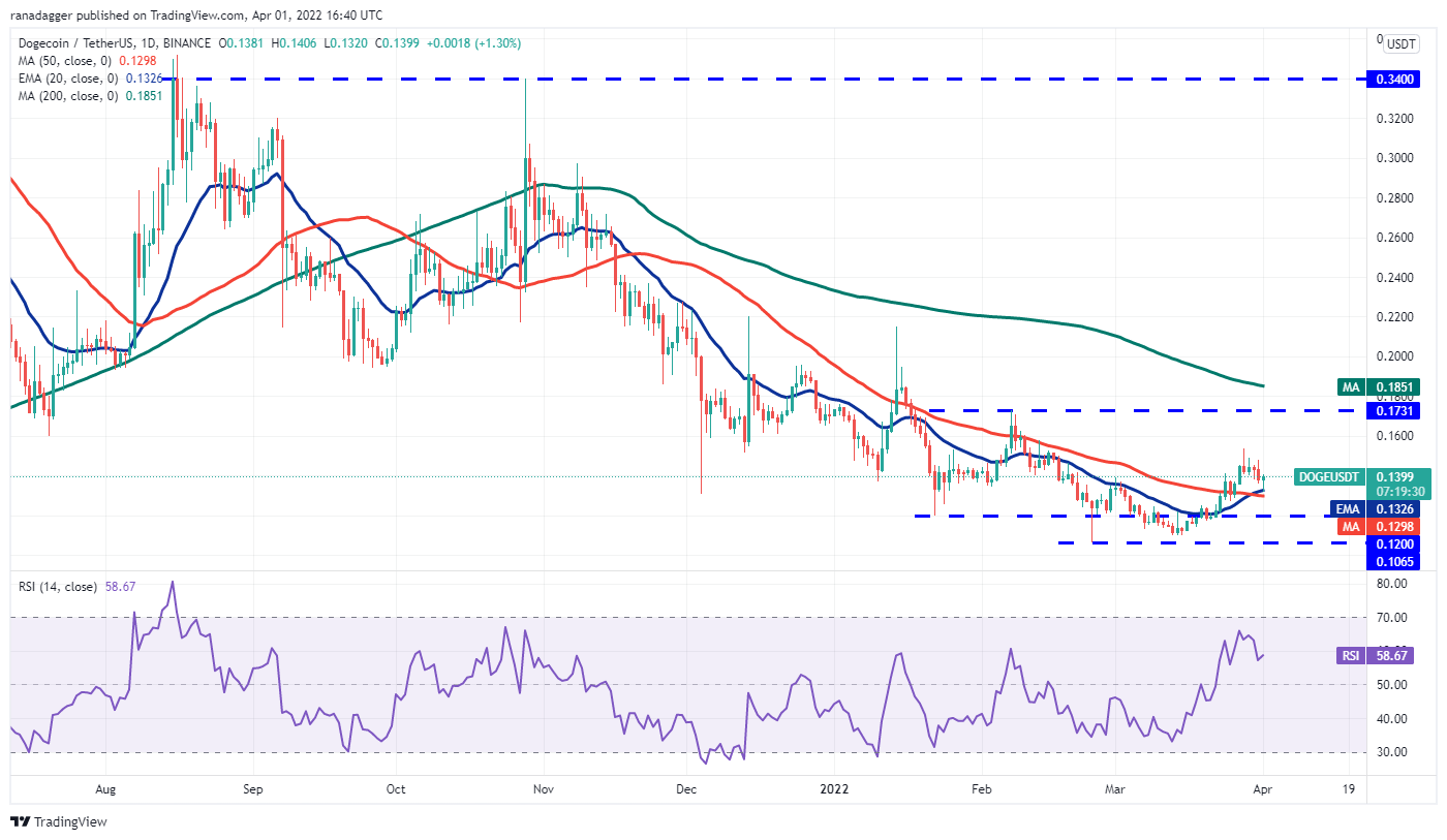 Dogecoin (DOGE) turned down from $0.15 on March 28 and dropped to the moving averages. This is an important support for the buyers to defend if they want the bullish sentiment to remain intact.