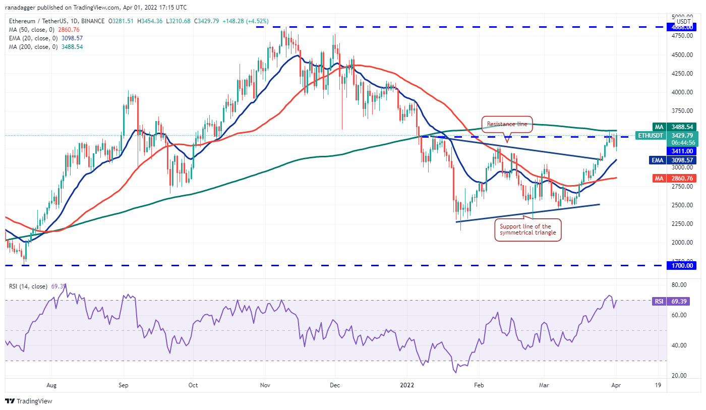Ether (ETH) turned down from the 200-day SMA ($3,488) on March 29 but the shallow correction and the sharp recovery suggest strong demand at lower levels.