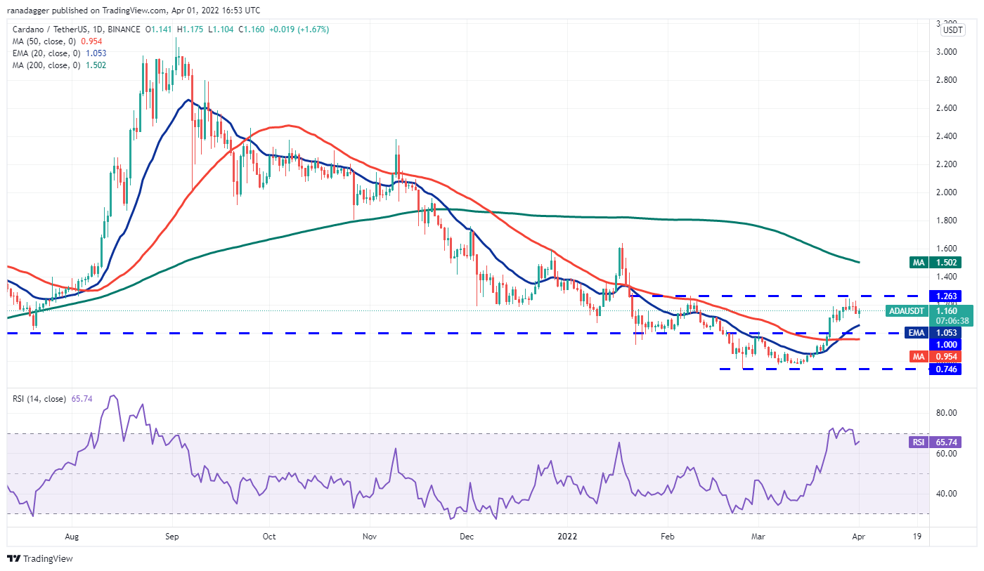 Cardano (ADA) turned down from the overhead resistance at $1.26, suggesting that the bears are defending the level with vigor. The price could now drop to the 20-day EMA ($1.05), which is an important level to keep an eye on.