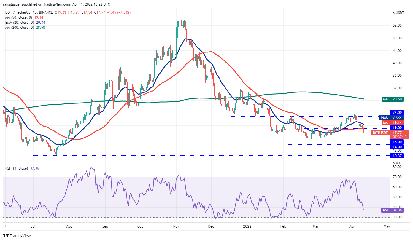 The bulls defended the 50-day SMA ($19) from April 8 to 10 but the failure to push Polkadot (DOT) above the 20-day EMA ($20) may have attracted selling. That has pulled the price below the strong support at $19.
