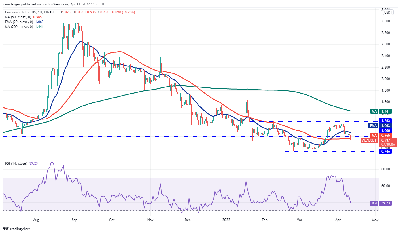 Cardano (ADA) made several attempts to rise back above the 20-day EMA ($1.06) in the past few days but the bears did not relent. The selling intensified on April 11 and the bears pulled the price below the 50-day SMA ($0.96).