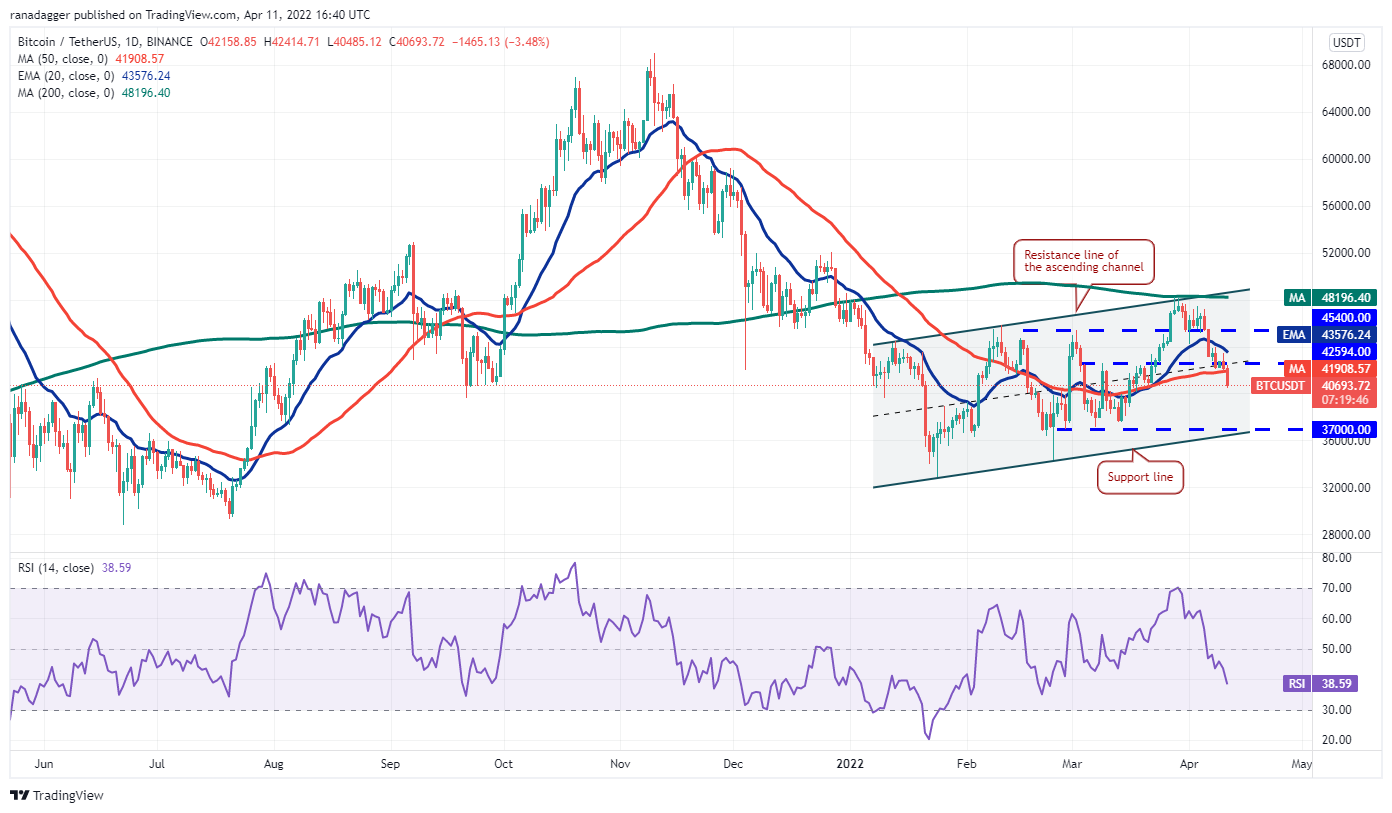 The selling picked up momentum on April 11 and the bears have pulled the price below the 50-day SMA. There is minor support at the psychological level at $40,000 but if it cracks, the BTC/USDT pair could plummet to the support line of the ascending channel. The bulls are likely to defend this level with all their might.