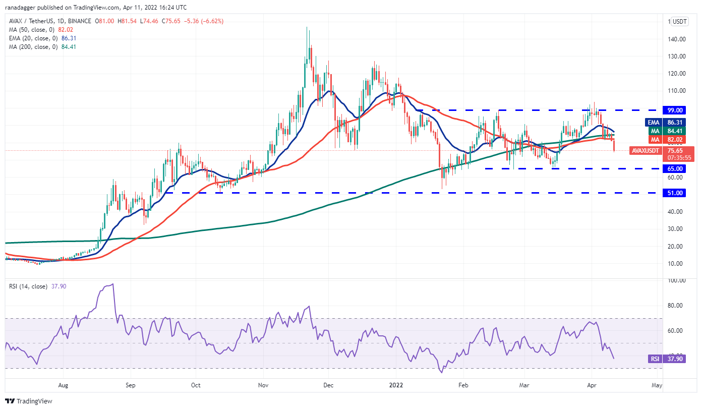 The bulls failed to sustain Avalanche (AVAX) above the 20-day EMA ($86) on April 8, suggesting that the bears are defending this level. This may have led to further selling and the price dipped below the 50-day SMA ($82) on April 10.