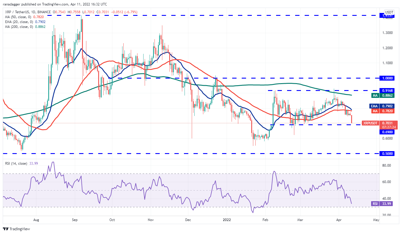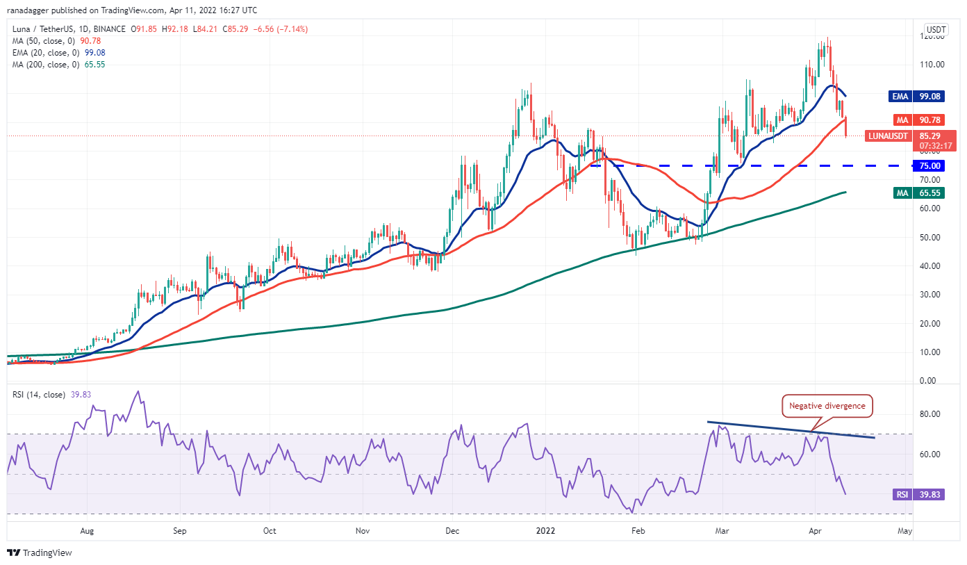 Terra’s LUNA token plunged and closed below the 20-day EMA ($99) on April 8. The bulls tried a recovery on April 9 but could not challenge the 20-day EMA. This may have attracted further selling and the bears have pulled the price below the 50-day SMA ($90).