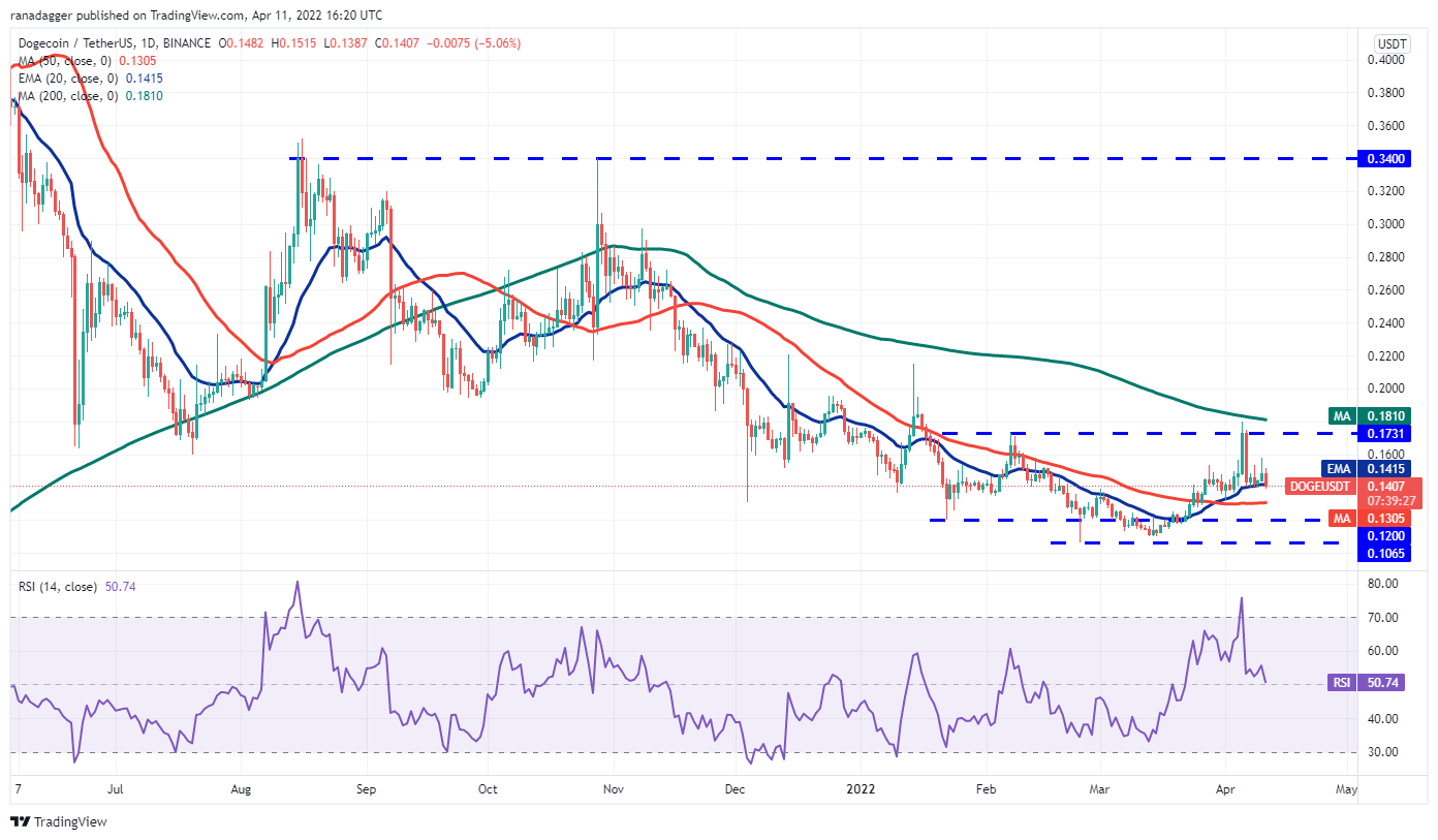 Dogecoin (DOGE) attempted a rally on April 10 but the long wick on the candlestick shows that bears sold at higher levels. The bears will now try to sink and sustain the price below the 20-day EMA ($0.14).