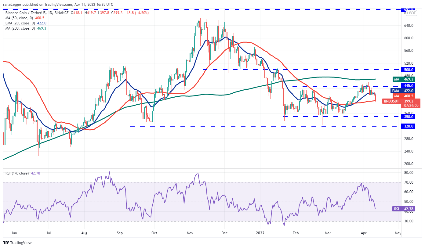 The buyers tried to push the price back above the 20-day EMA in the past two days but could not sustain the higher levels. This renewed the selling and the BNB/USDT pair has dropped to the 50-day SMA ($400).