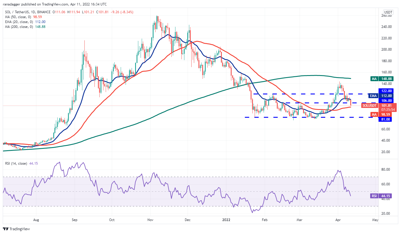 Solana (SOL) turned down from the overhead resistance at $122 on April 8 and plunged below the 20-day EMA ($112). The bulls pushed the price back above the 20-day EMA on April 10 but could not sustain the higher levels. This suggests that bears are selling on rallies.