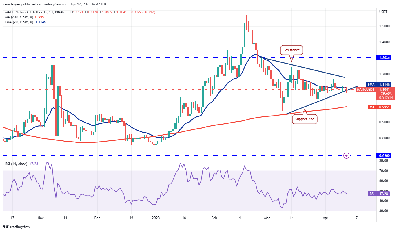 Contrarily, if the price turns up from the current level and breaks above the 20-day EMA ($1.11), it will suggest that the breakdown may have been a bear trap. The pair may then attempt to rise above the resistance line of the triangle.