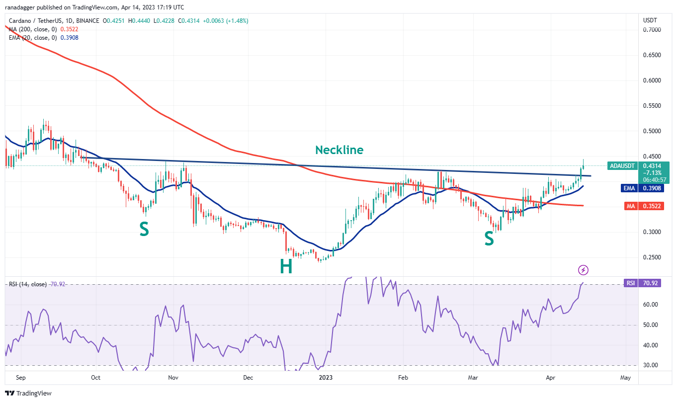 Cardano (ADA) soared above the neckline of the inverse H&S pattern on April 13, completing the reversal setup.