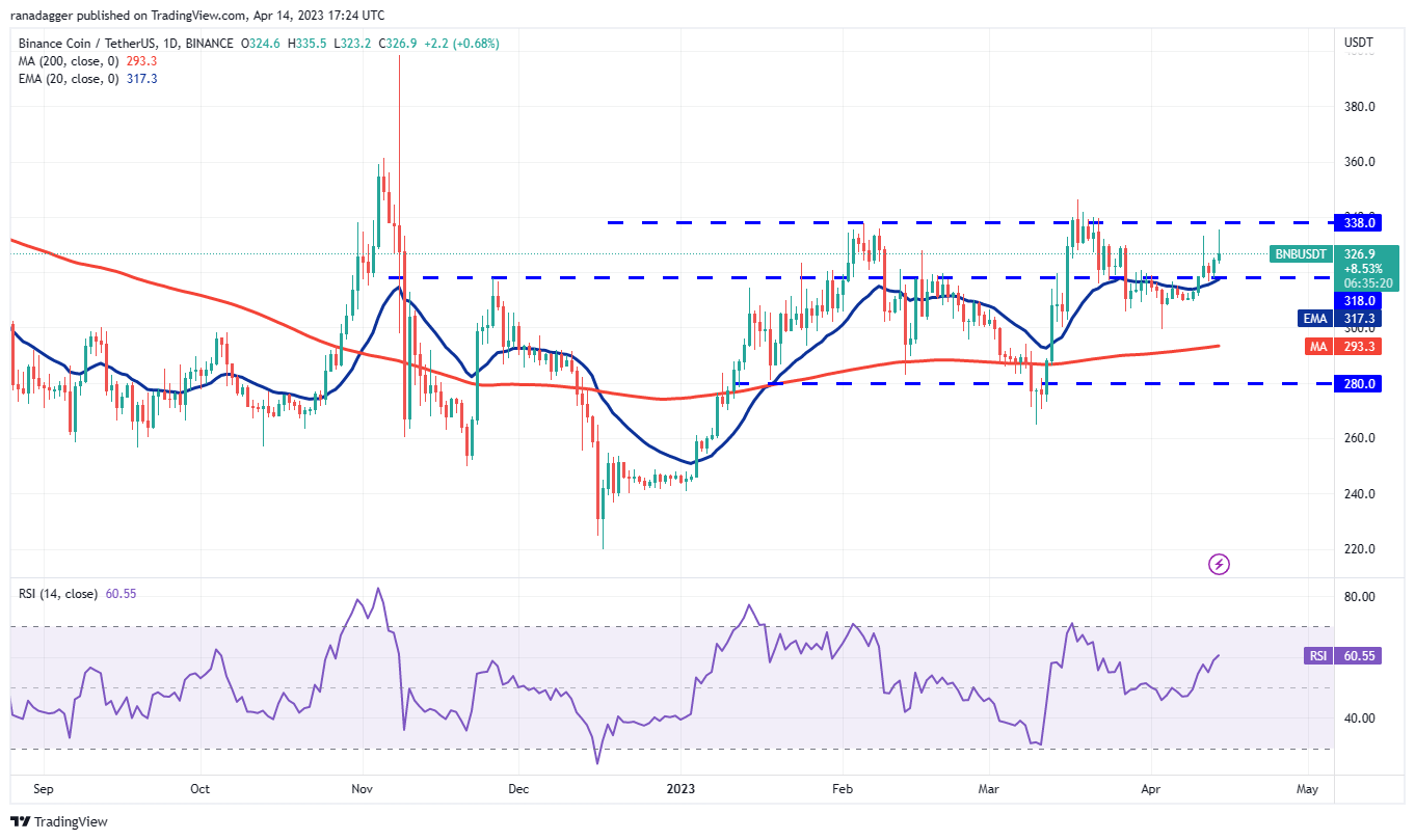 The bulls did not allow BNB (BNB) to dip below the 20-day EMA ($317) on April 12 and 13. This indicates that the sentiment is turning positive and traders are buying the dips.