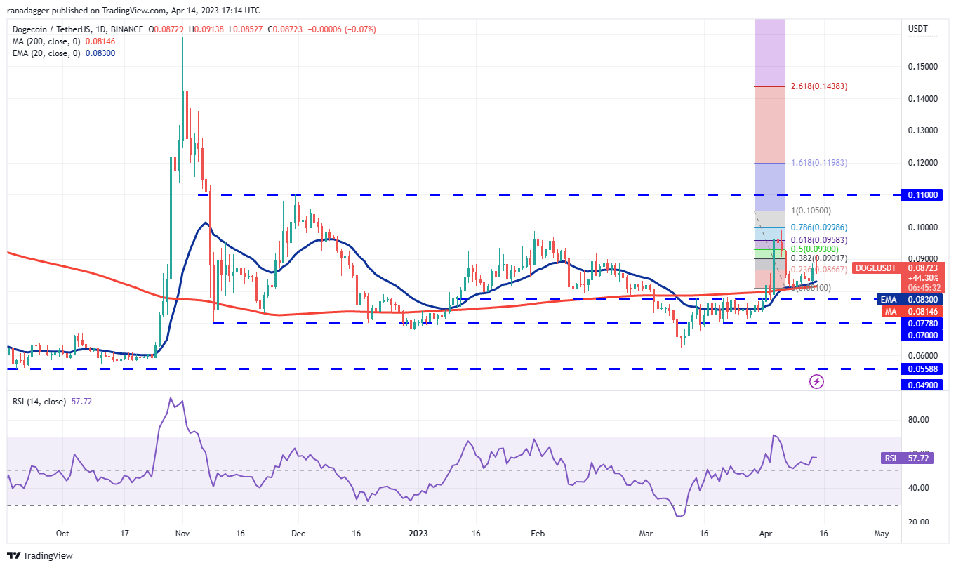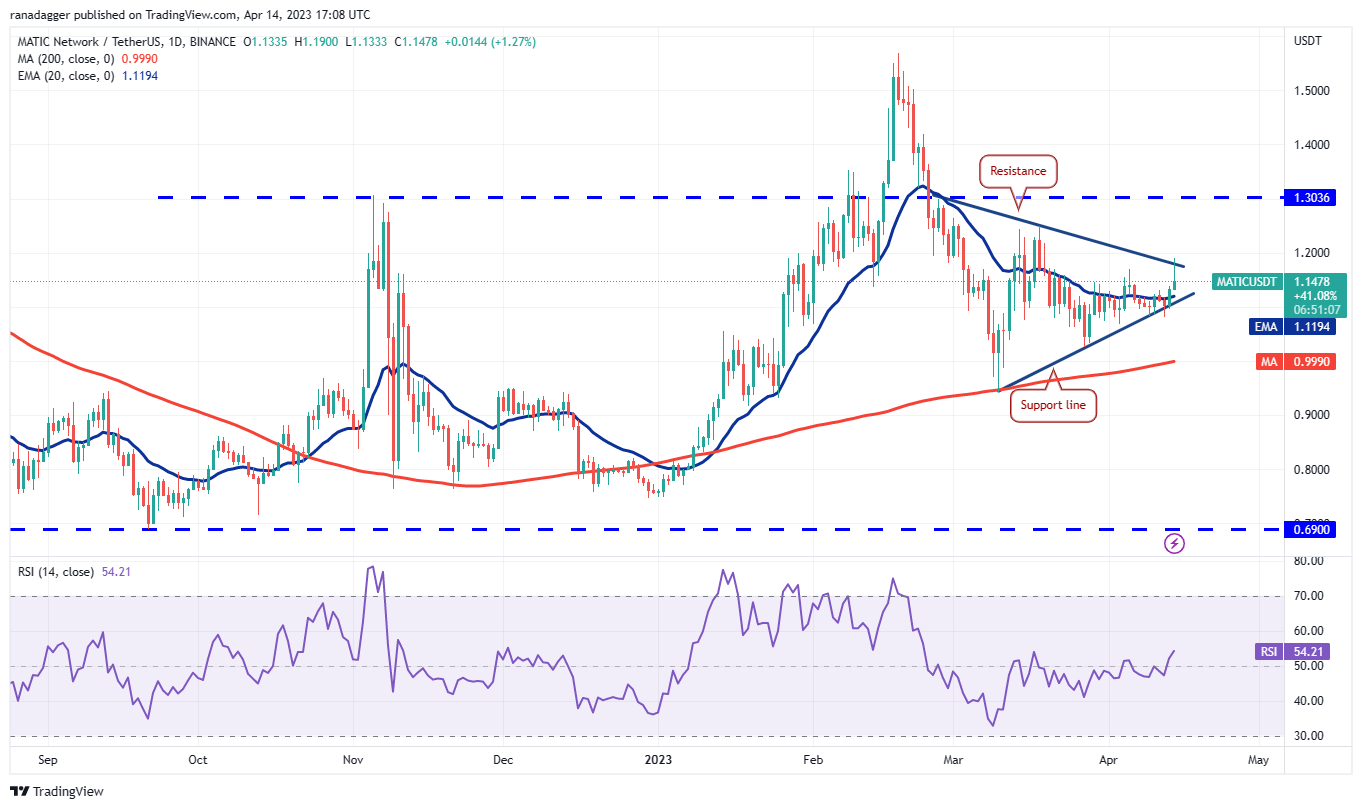 The MATIC/USDT pair turned up and broke above the 20-day EMA ($1.11) on April 13 That may have trapped the aggressive bears, resulting in a short squeeze. The pair reached the resistance line of the triangle on April 14 where the bears are posing a strong challenge.