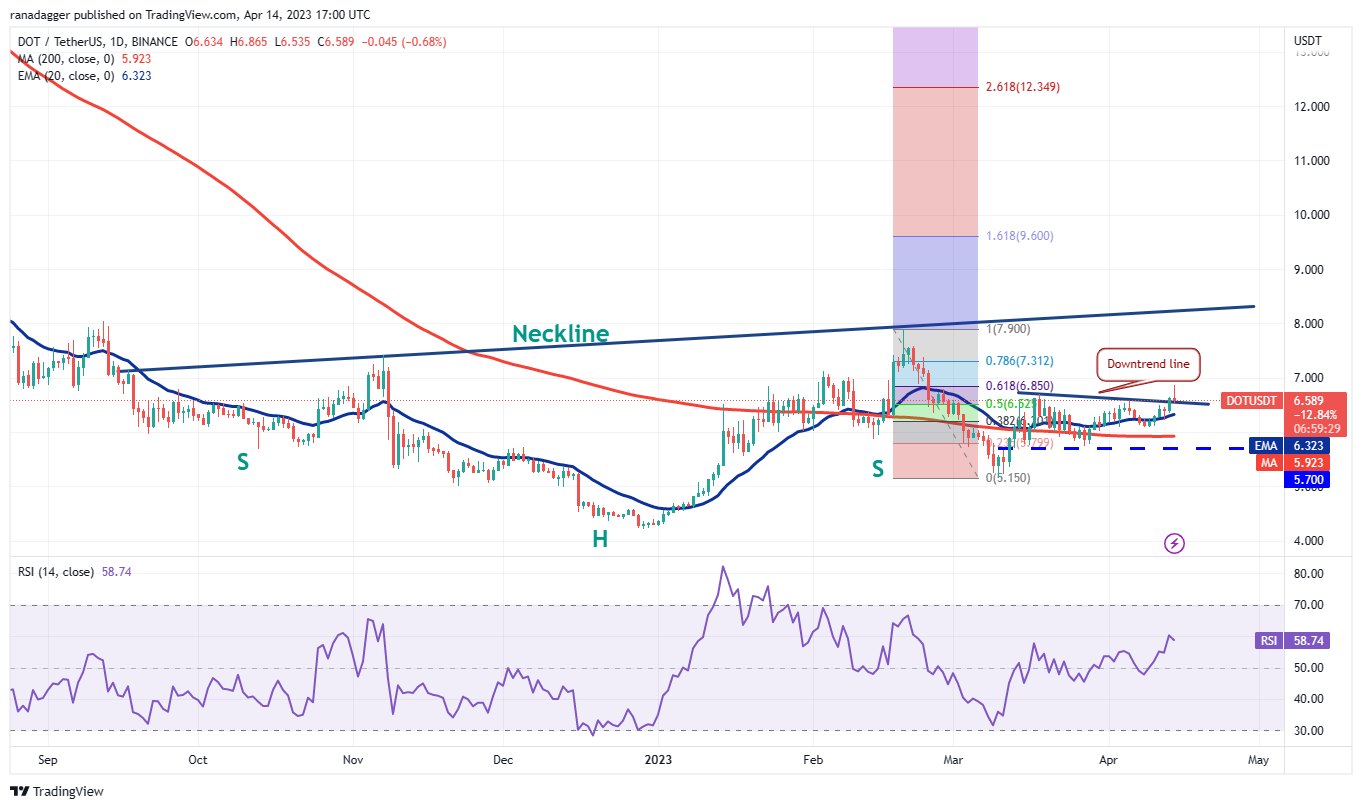 The long tail on the April 12 candlestick shows that the bulls purchased the dip to the 20-day EMA ($6.32). Polkadot (DOT) continued its northward march and broke above the downtrend line on April 13 but the bulls are facing selling at higher levels.