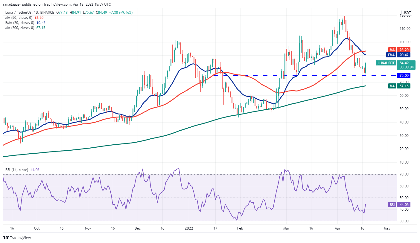 Terra’s LUNA token sharply rebounded off the strong support at $75 on April 18, indicating aggressive buying at this level. The bulls will now attempt to push the price to the 20-day EMA ($90) where they are likely to encounter strong selling by the bears.