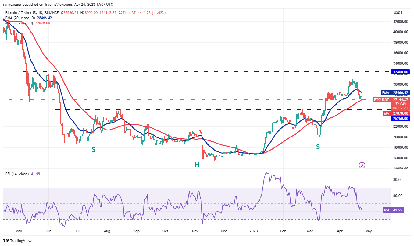 Bitcoin is stuck between the moving averages for the past few days, indicating indecision among the bulls and the bears. The bulls are buying the dips to the 50-day SMA ($27,078) while the bears are protecting the 20-day EMA ($28,466).