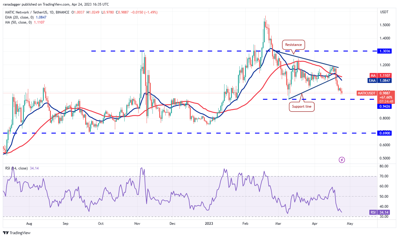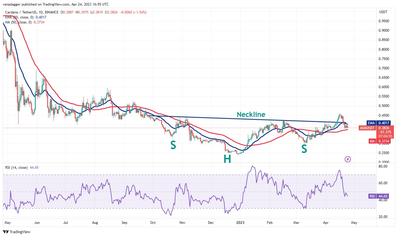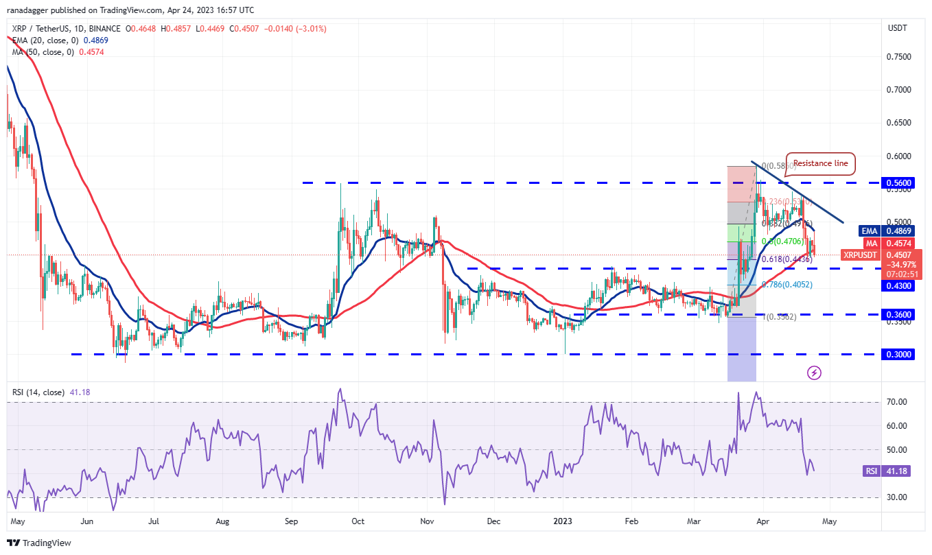 The bulls defended the 50-day SMA ($0.45) on April 22 and tried to thrust XRP (XRP) above the 20-day EMA ($0.48) on April 24 but the long wick on the candlestick shows that the bears are active at higher levels.