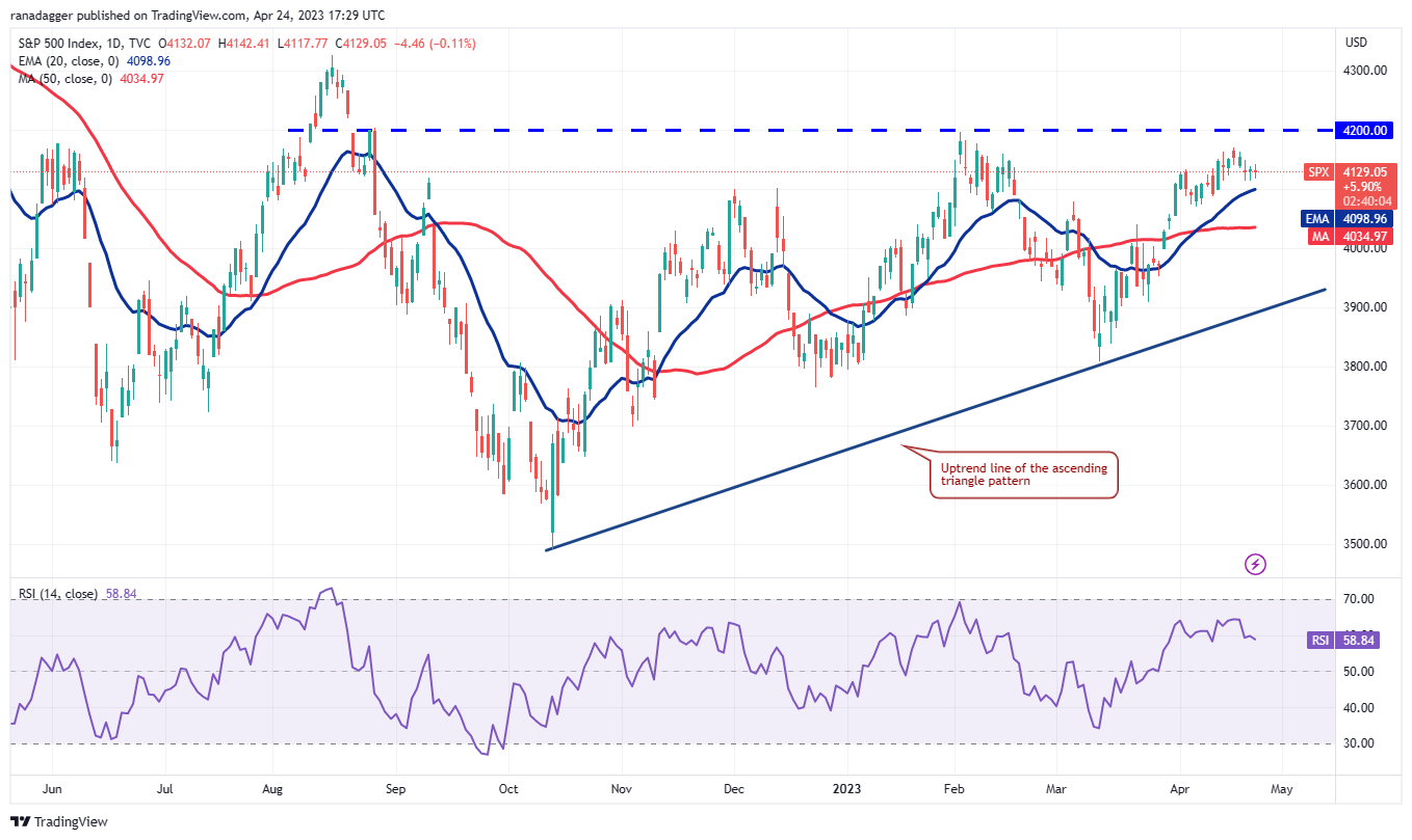 The S&P 500 index (SPX) has pulled back to the 20-day exponential moving average (4,098), indicating that the bears are selling the rallies near 4,200.