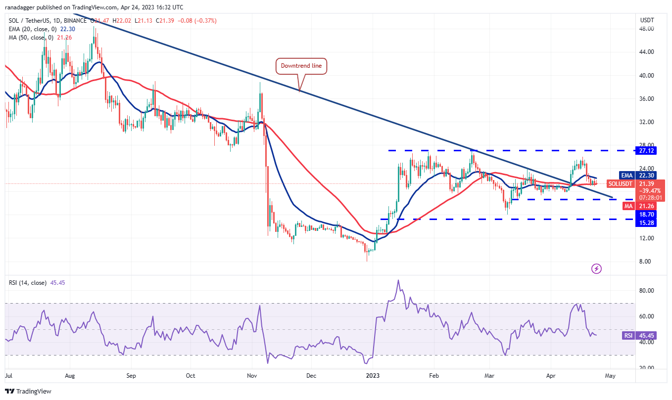 The bulls are trying to protect the 50-day SMA ($21.26) but the bears have kept up the pressure and not allowed Solana (SOL) to sustain above the 20-day EMA ($22.30).