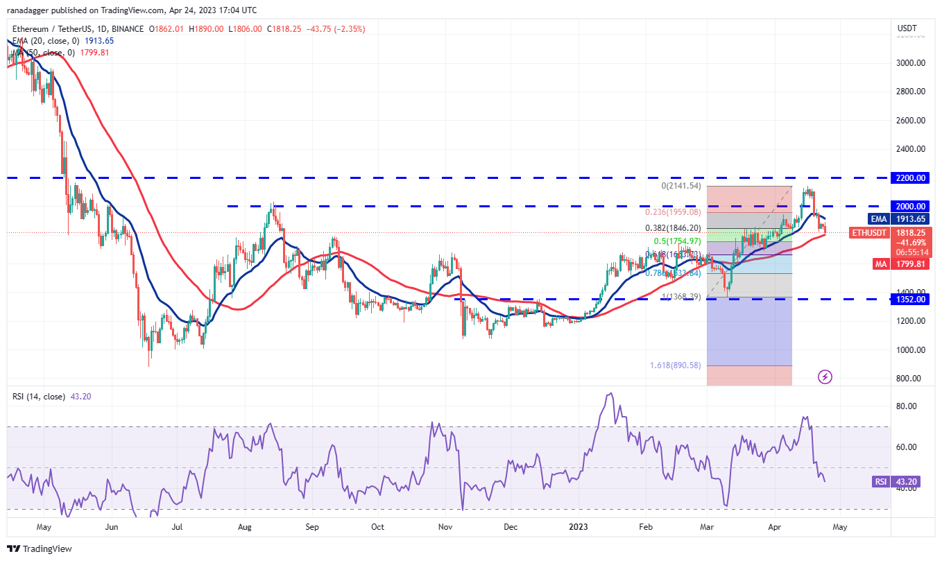 The bears will try to strengthen their position further by pulling the price below the 50-day SMA ($1,799). If they do that, the ETH/USDT pair could extend its decline to the 61.8% retracement level of $1,663.