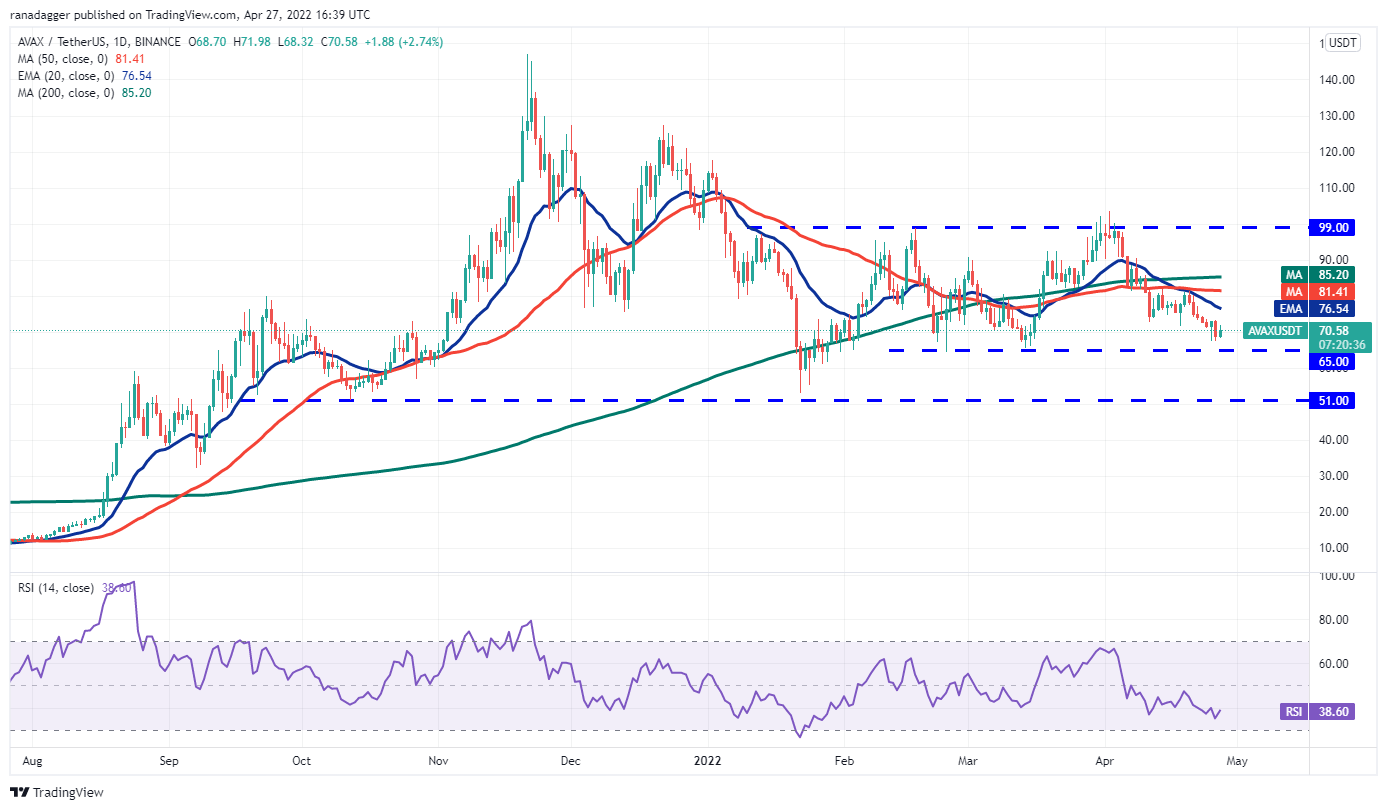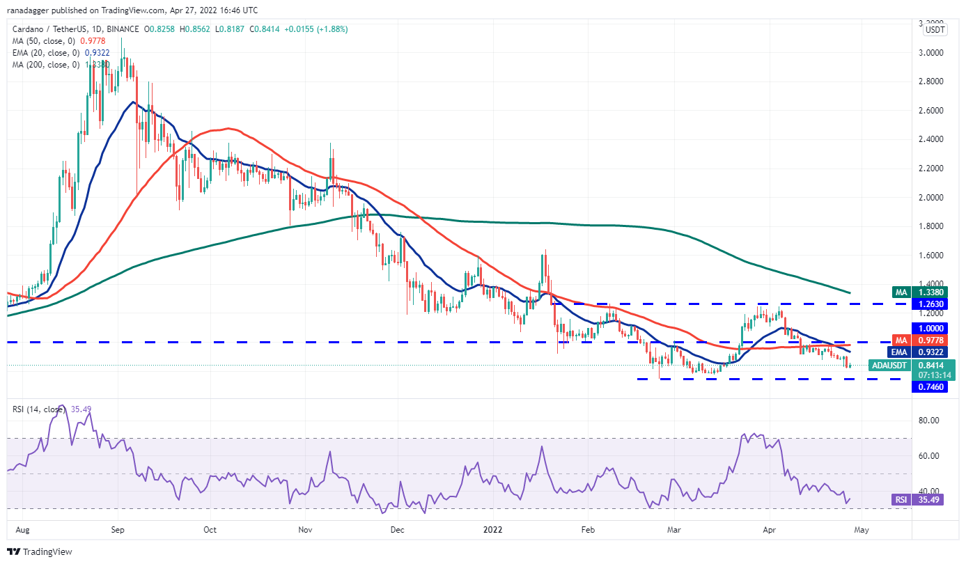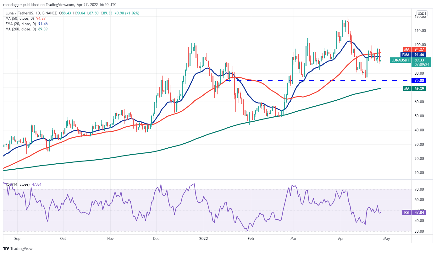 The bears pulled the price back below the 20-day EMA on April 26. If the price slips and sustains below $86, the LUNA/USDT pair could continue to slide toward the strong support at $75. The buyers are likely to defend this level aggressively.