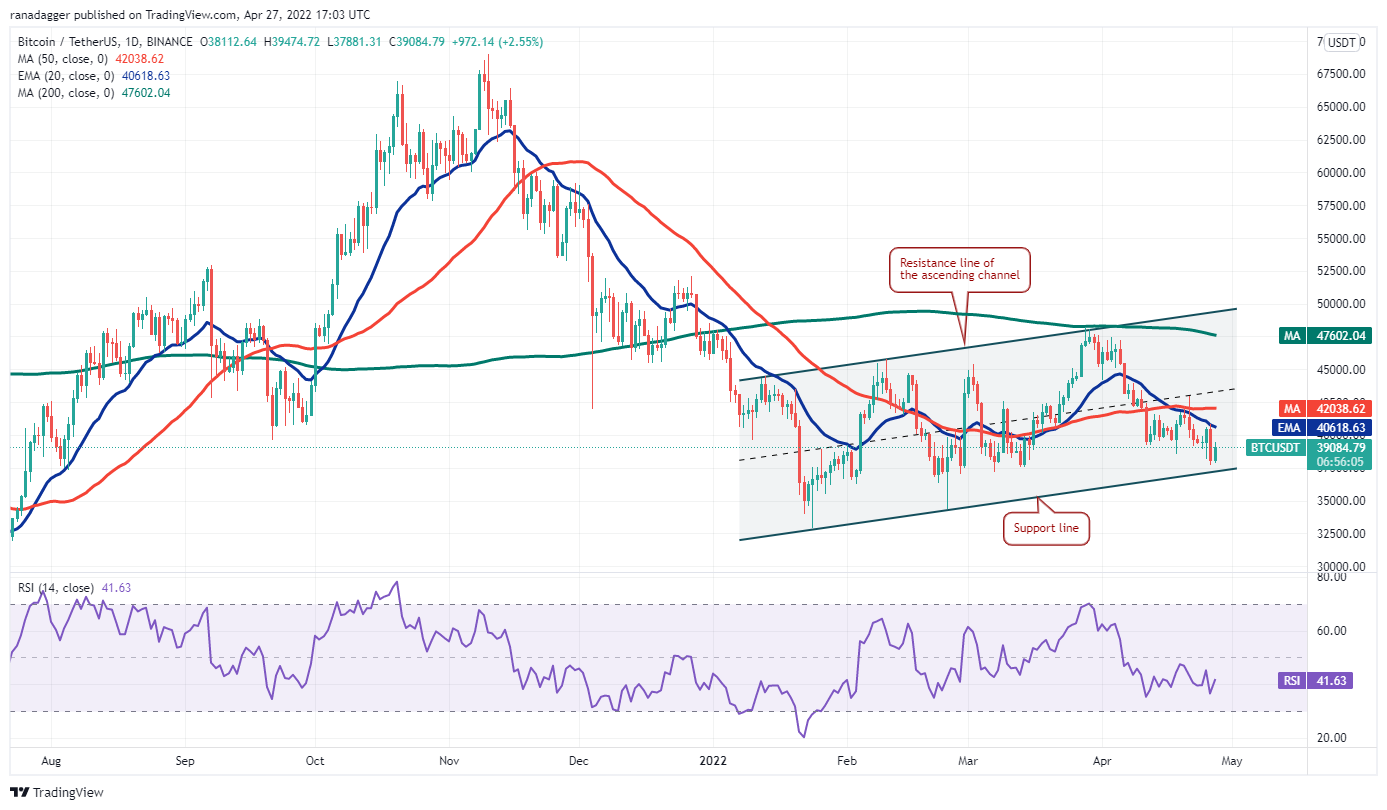 Bitcoin’s recovery on April 26 stalled at the 20-day exponential moving average ($40,618), suggesting that the sentiment remains negative and traders are selling on rallies. A minor positive is that the price has rebounded off the support line of the ascending channel today indicating that bulls are attempting to defend this level.