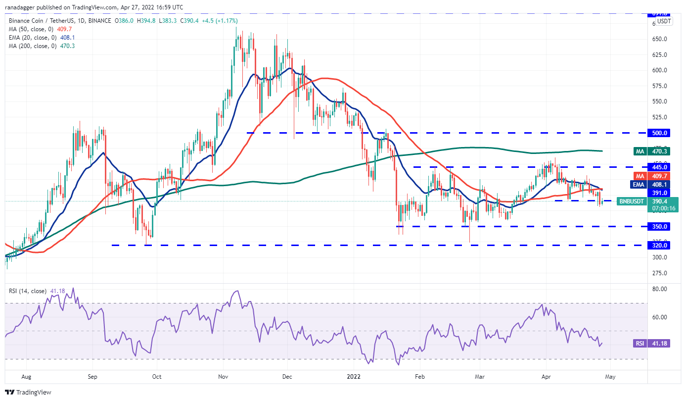 Binance Coin (BNB) closed below the immediate support at $391 on April 26, indicating near-term weakness. The bulls are currently attempting to push the price back above the breakdown level.