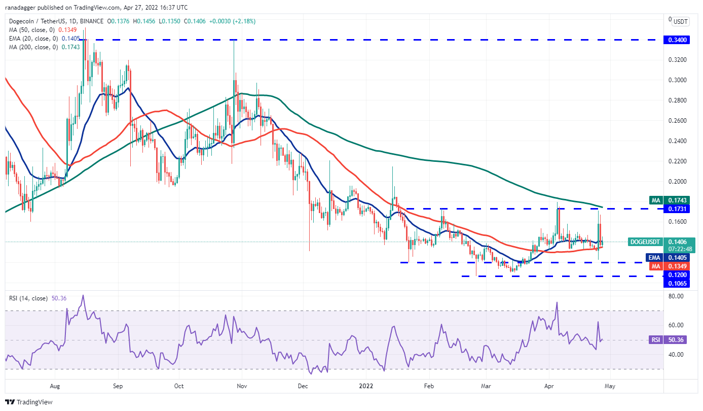 Dogecoin (DOGE) soared to the overhead resistance at $0.17 on April 25 but the bulls could not overcome this barrier. The failure to do so may have attracted profit-booking by short-term traders which pulled the price back below the 20-day EMA ($0.14) on April 26.