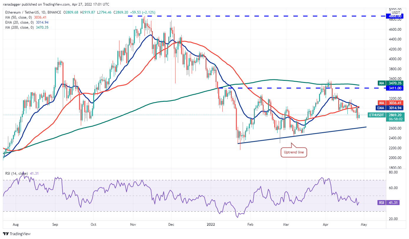 Ether (ETH) once again turned down from the 20-day EMA ($3,014) on April 26, indicating that bears continue to sell on rallies to this level. The bears will now try to pull the price to the uptrend line.