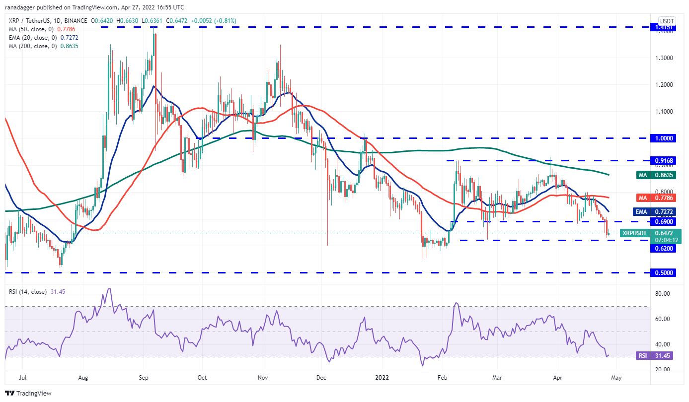 Ripple’s (XRP) long tail on the April 25 candlestick shows strong buying at lower levels. However, the bulls could not sustain the price above $0.70 on April 26, resulting in another sell-off.