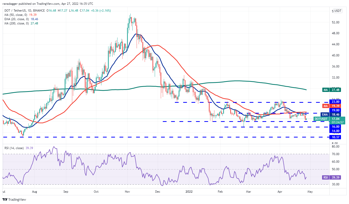 The price has bounced off the support and the buyers will now try to propel the DOT/USDT pair above the 50-day SMA ($19.39). If they succeed, it will suggest that the pair may extend its stay inside the range for a few more days.