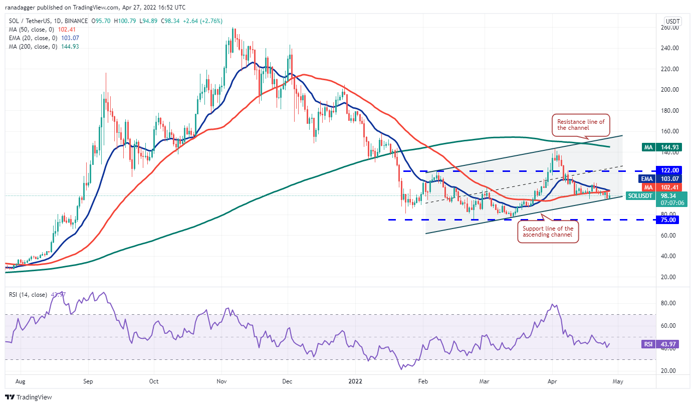 The bulls have been defending the support line of the ascending channel for the past two days but they haven’t been able to push Solana (SOL) above the 20-day EMA ($103). This suggests that demand dries up at higher levels.