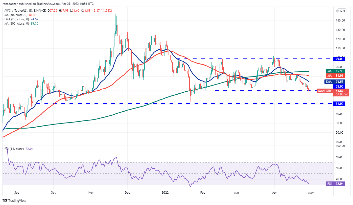 However, the bears are likely to have other plans. The downsloping 20-day EMA ($74) and the RSI near the oversold territory favor the bears. If the price breaks below $65, the AVAX/USDT pair could drop to the critical support at $51.