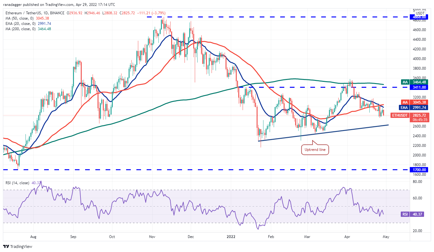 Bitcoin pulled back to the 20-day exponential moving average ($40,363) on April 28 but the long wick on the day’s candlestick suggests that bears are selling on rallies to this level.