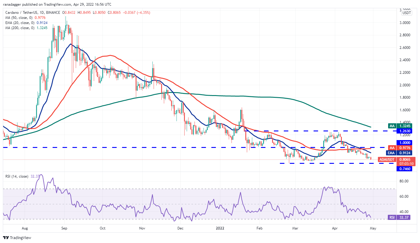 Cardano (ADA) tried to start a relief rally from $0.81 on April 27 but failed to reach the 20-day EMA ($0.91). The selling resumed today and the bears will now attempt to pull the price to the strong support at $0.74.