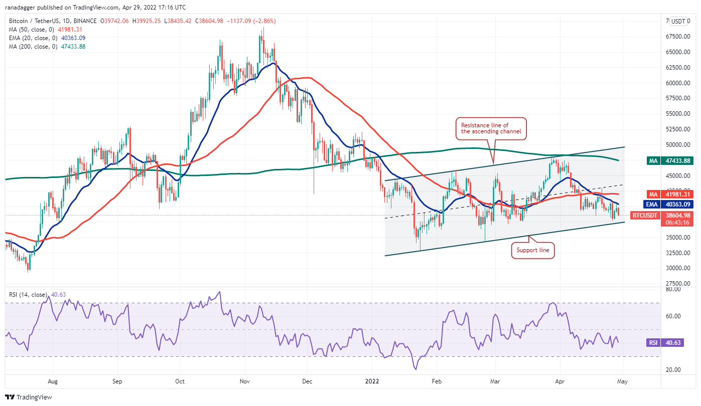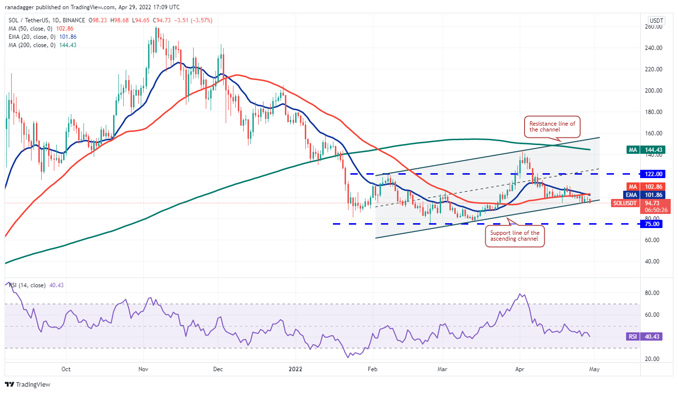 Solana (SOL) bounced off the support line of the ascending channel on April 27 but the bulls could not sustain the positive momentum and clear the overhead hurdle at the 20-day EMA ($101).