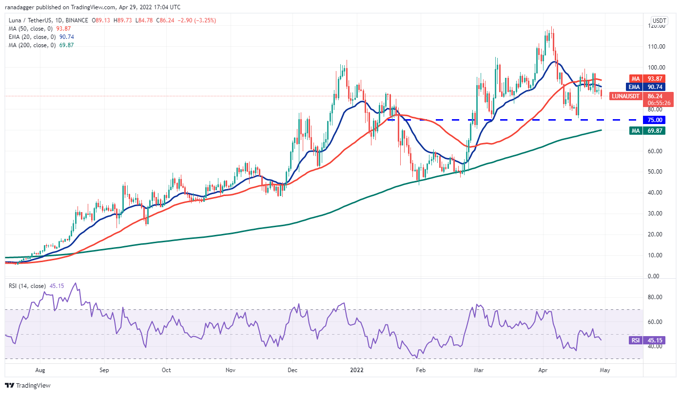 The RSI has dipped into the negative zone, indicating that the bullish momentum has weakened. If bears sustain the price below $86, the LUNA/USDT pair could drop to the strong support at $75. The bulls are expected to defend the zone between $75 and the 200-day EMA ($69) aggressively.