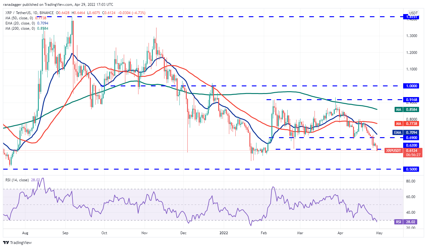 Ripple (XRP) rebounded off the support at $0.62 on April 26 but the weak rebound suggested a lack of aggressive buying. The selling resumed today and the bears have pulled the price below the critical support.